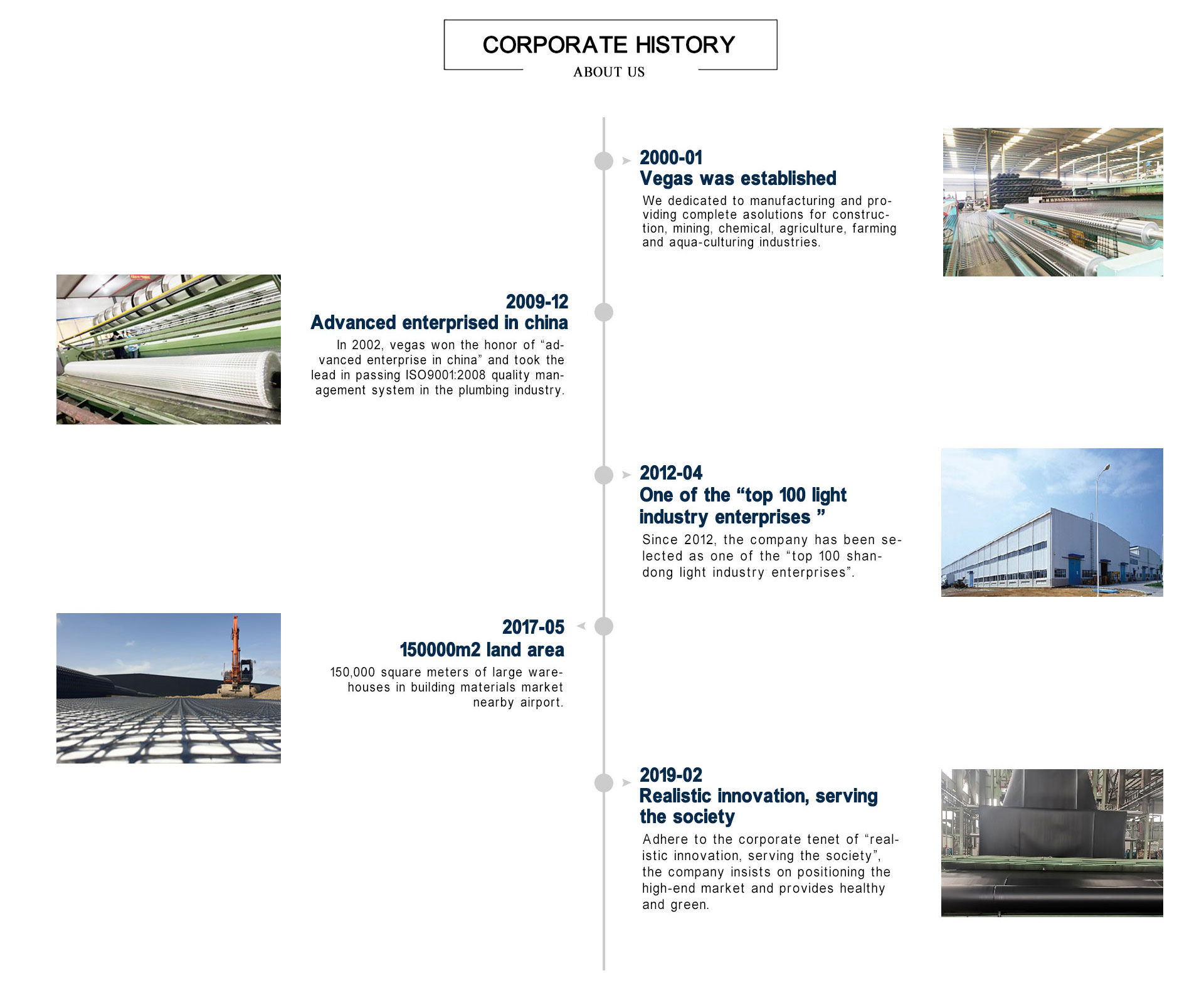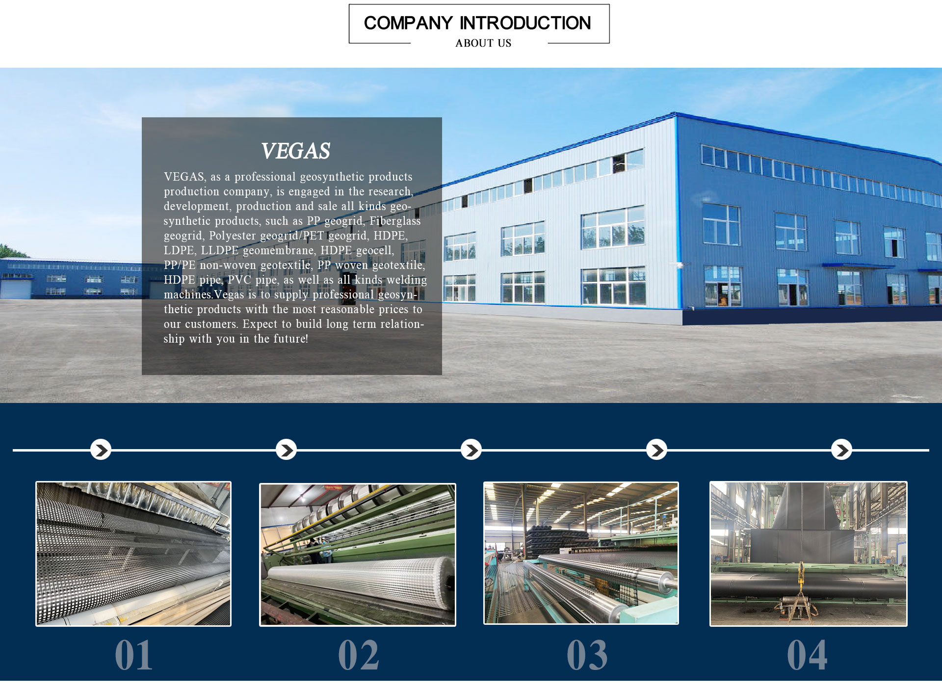 Shandong Vegas Engineering Materials Co.,Ltd (Vegas), as a professional geosynthetic products production company, is engaged in the research, development, production and sale all kinds geosynthetic products, such as PP biaxial geogrid, Fiberglass geogrid, Polyester geogrid/PET geogrid,PP/HDPE uniaxial geogrid, HDPE, LDPE, LLDPE geomembrane, HDPE geocell, PP/PE non-woven geotextile, PP woven geotextile, HDPE pipe, PVC pipe, as well as all kinds weldi...